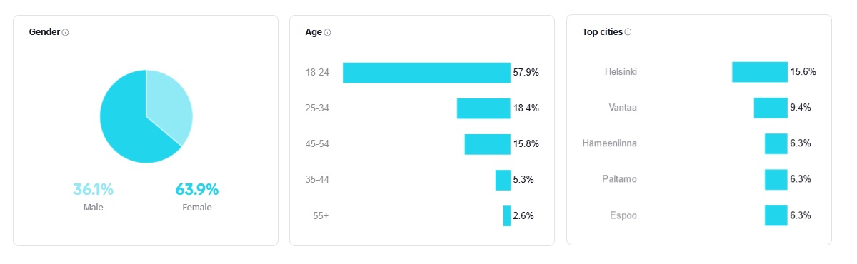 TikTok ei kerro tilastoja alle 18- vuotiaiden käyttäjien osalta. Silti tilastot kertovat mielenkiintoisia juttuja. Yli 25 -vuotiaiden osuus seuraajista on yhteensä 42 %. Stereotypia siitä, että TikTok olisi vain teini-ikäisten valtakunta, rikkoutuu näillä tilastoilla.